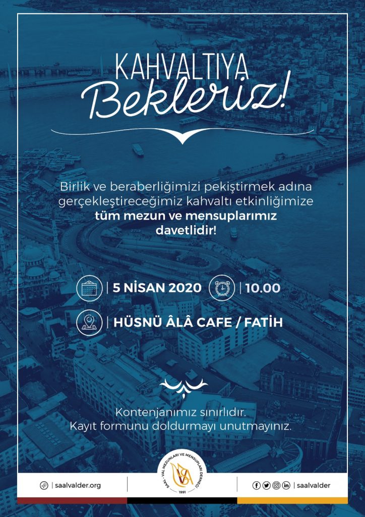 Sâmiha Ayverdi Anadolu Lisesi Vatan Anadolu Lisesi Mezunları ve Mensupları Derneği olarak, mezunlarımızın ve mensuplarımızın aynı çatı altında bulunmasını ve birbirleriyle olan ilişkilerini kuvvetlendirmeyi önemsiyoruz. Etkinliğimiz 5 Nisan tarihinde, İstanbul’un güzide semtlerinden Fatih’te yer alan Hüsnü Âlâ Cafe’de gerçekleşecektir. İstanbul’un güzel manzarasına karşı yapacağımız kahvaltıda, bir yandan hasret giderirken bir yandan da eski günleri anacağız. Dernek olarak gerçekleştirdiğimiz bu etkinlikte siz değerli mezun ve mensuplarımızı da aramızda görmekten mutluluk duyarız.